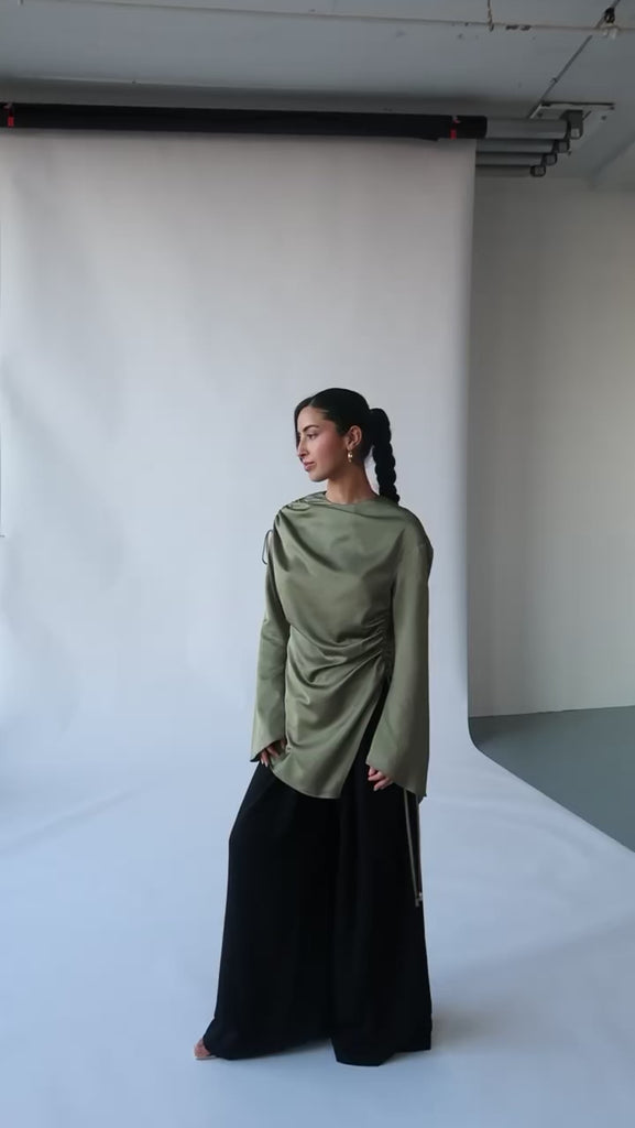 This tunic is the embodiment of the Summer Evenings style—from asymmetric silhouettes, to custom branded hardware, to intricate ruching details, to high quality satin finishes, this satin tunic is a one of a kind formal piece to add to your modest wardrobe. The combination of details makes it the perfect understated, yet stylish top choice for an array of events. The bottoms pictured here are not included— only the tunic.