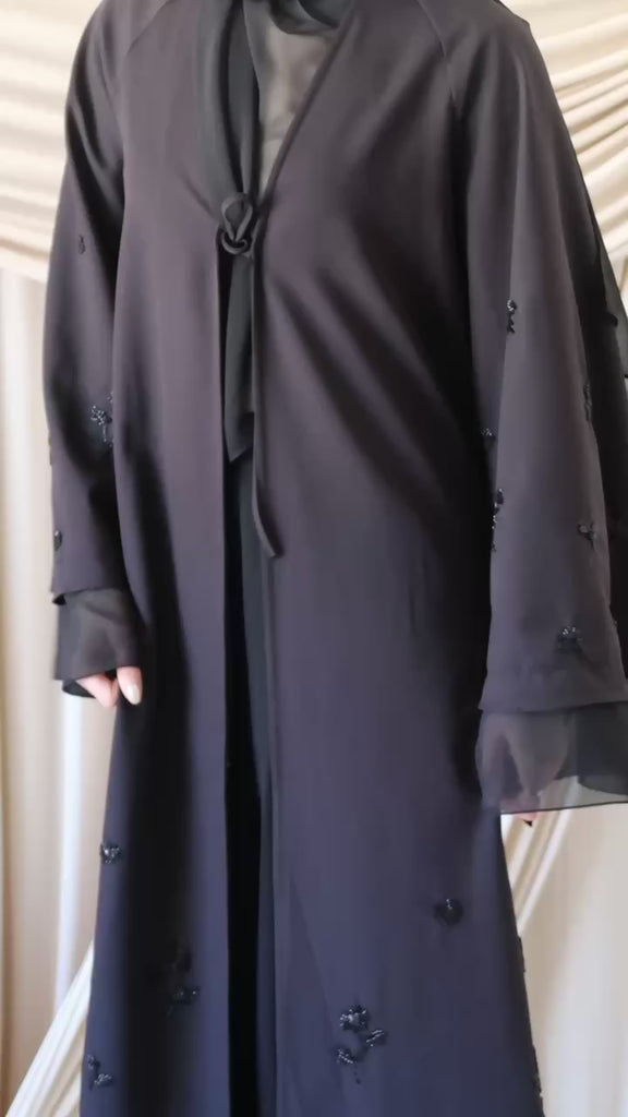 Black Beaded Floral Chiffon Cuff Abaya (2 pc)