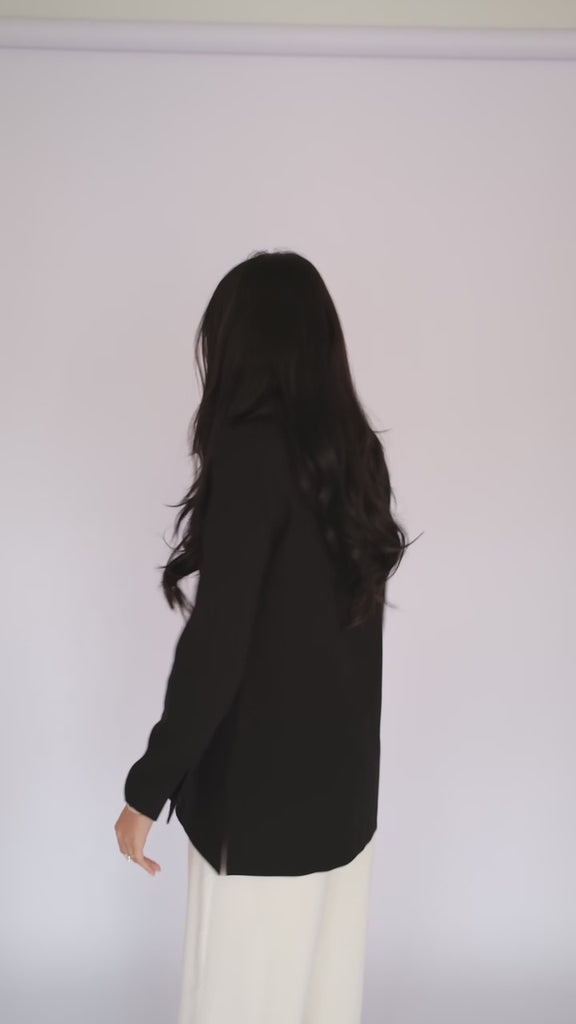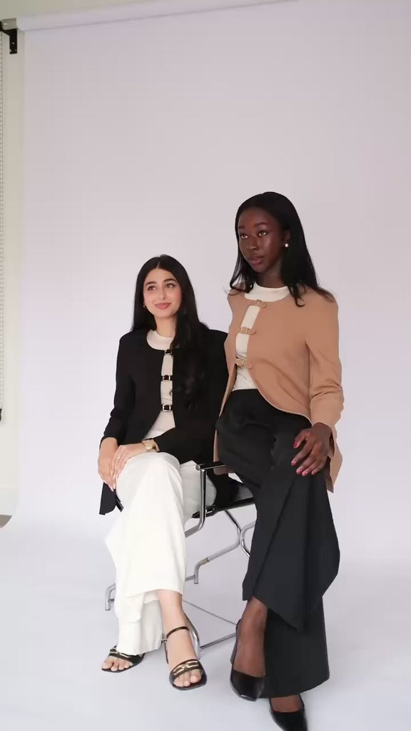 Utilitarianism meets sophistication with our Buckled Blazer Tunic. Designed for versatility, it features a tailored silhouette, accented with gold hardware buckles along the front for a polished, modern look. The slits in the cuffs and sides add ease of movement, and the buckles can be fastened for flexibility in the chest sizing. The bottoms & inner top pictured here are not included.