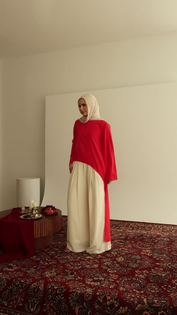 The High-Low Tunic is designed to move beautifully from iftar gatherings to year round celebrations. Its softly curved hemline creates a flattering high-low silhouette that adds dimension and elongates the figure, while maintaining full, effortless coverage. The dramatic bell sleeves bring graceful movement and a subtle touch of occasion, catching the light with every gesture.
