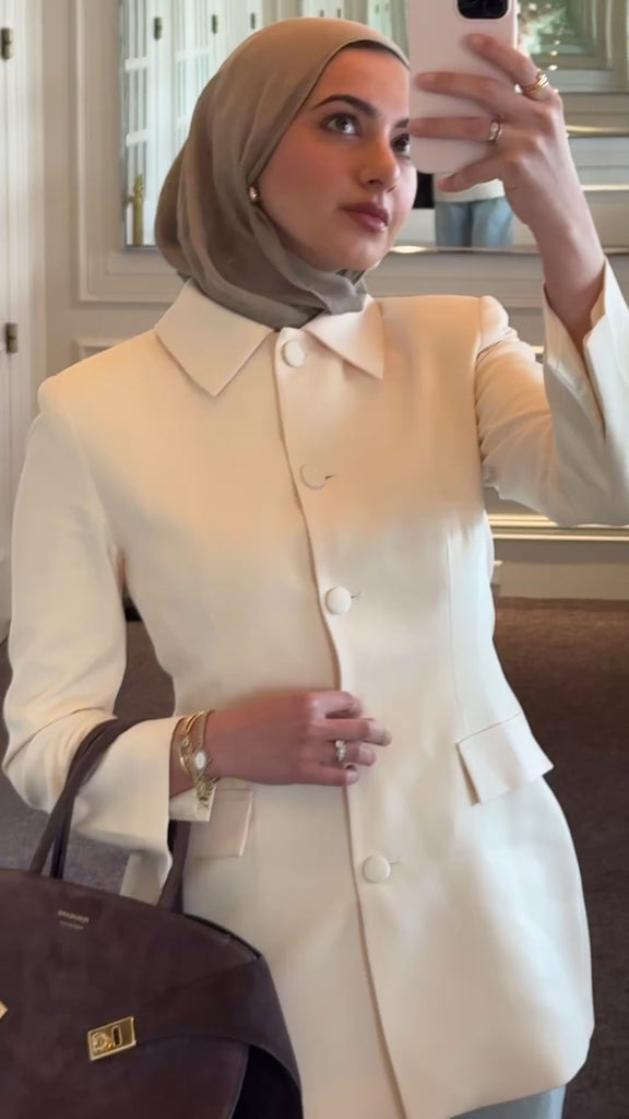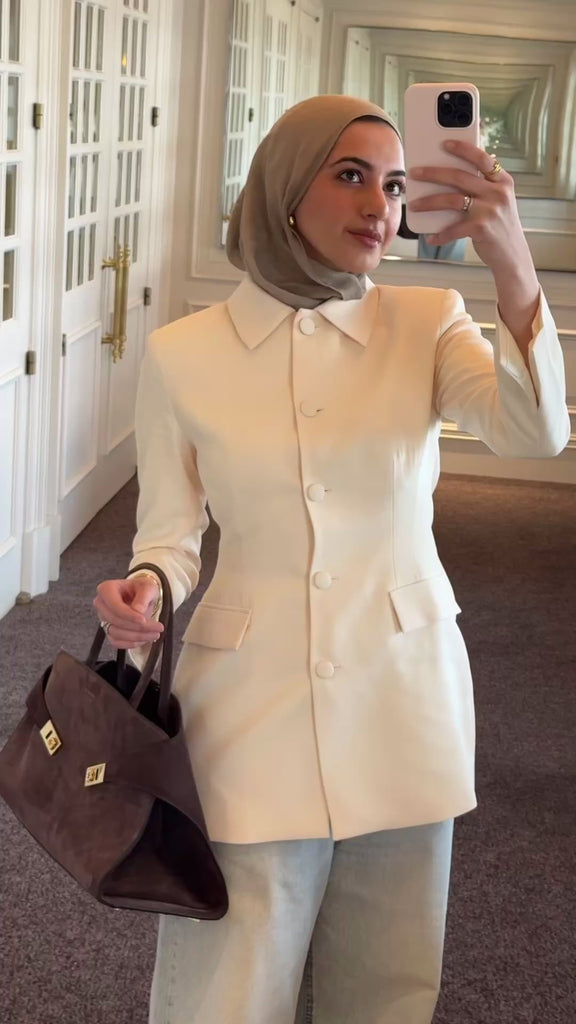 The Peplum Buttoned Blazer is a bold yet refined statement piece designed to elevate any modest wardrobe. Tailored with a structured silhouette, it features a flattering peplum waist that cinches gently before flaring into a graceful shape, creating a feminine and polished look. Finished with elegant button detailing and collar this blazer blends sophistication with modern edge—perfect for layering over dresses, skirts, or tailored trousers for both special occasions and elevated everyday styling. The bottoms pictured here are not included. We recommend pairing with our Cream Tailored Pants.
