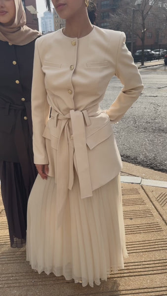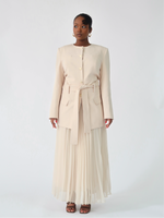 This versatile wardrobe piece will be your go-to item at your next formal event. Designed with shimmering fabric, meters of pleating, and lining all around, the pleated chiffon skirt is an effortless closet staple to pair with your own tops, or our blazer tunics. The top pictured here is not included— only the skirt.