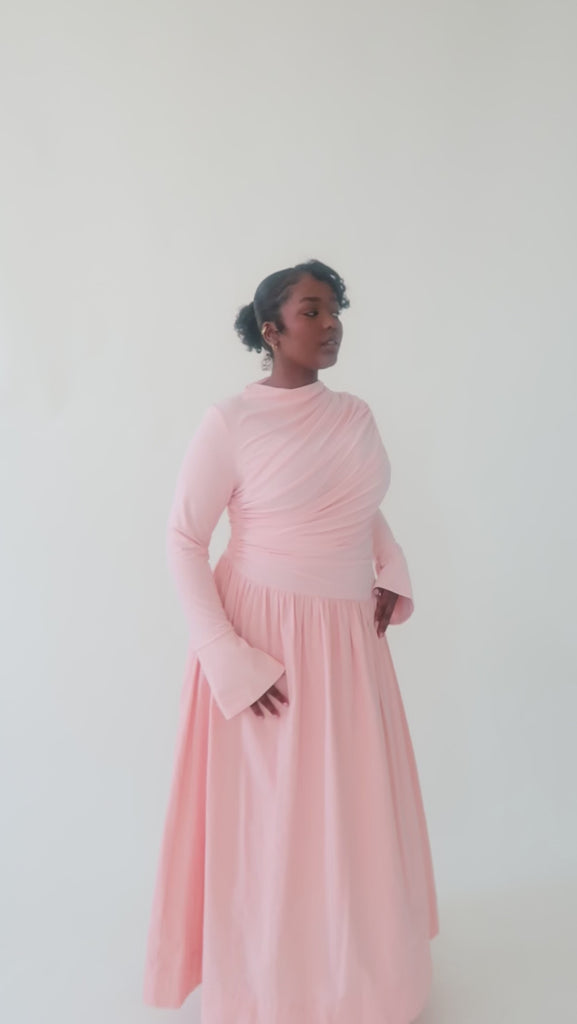 The Asymmetric Draped Dress offers a sophisticated and timeless look for numerous occasions year round. Designed with a batteau neckline, draped chest pleats followed by a flattering asymmetric waistline, down to the bell sleeves with slit cuffs, the details in this piece will have you feeling elegant, effortless and event-ready anytime.