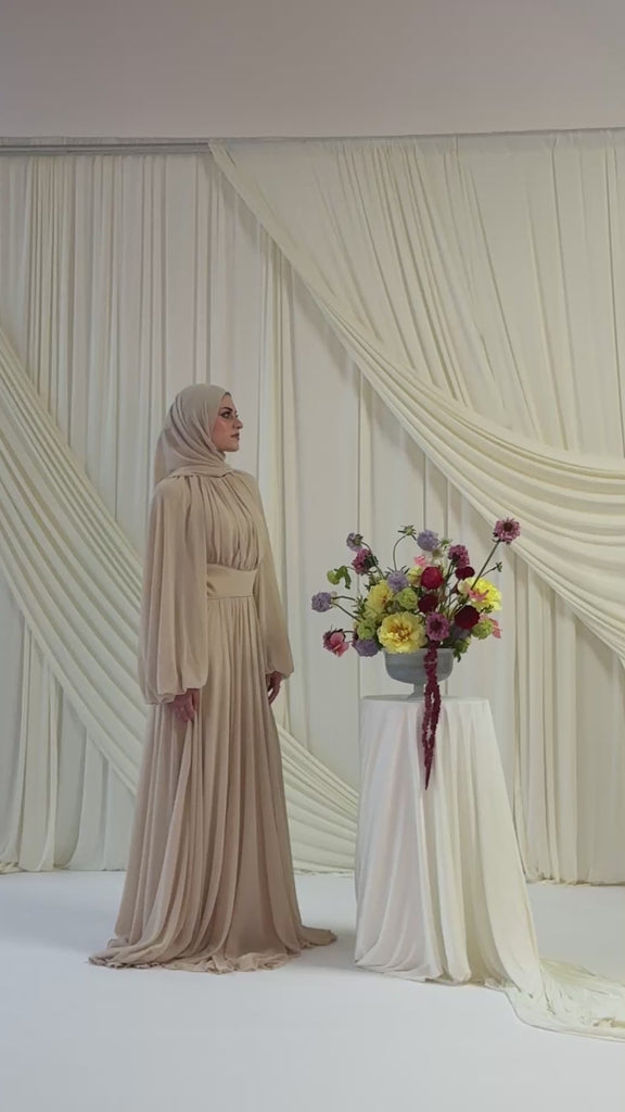 The Structured Belt Gown blends sophistication, simplicity and femininity in its unique flattering waistline, followed by the fluttering balloon sleeves, enchanting, flowing skirt and all around elegance.