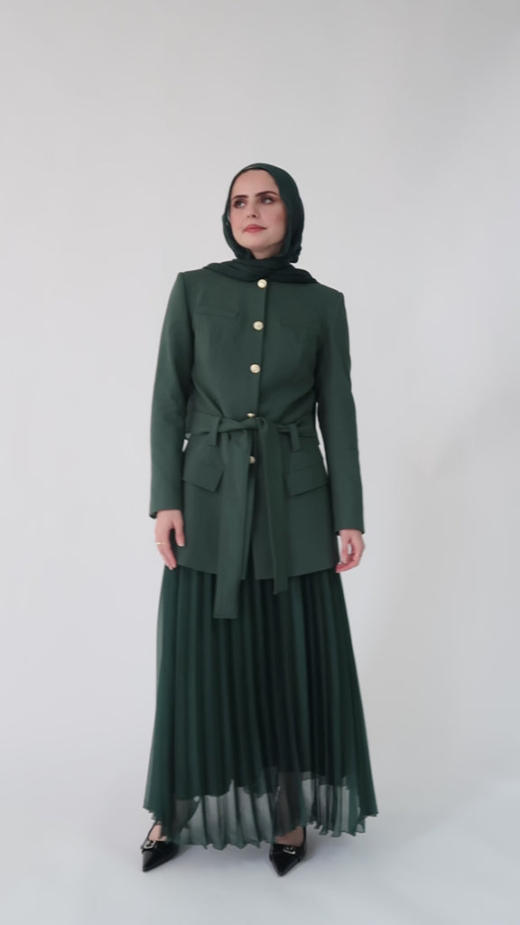 Introducing the SE Belted Jacket— made with custom hardware featuring our signature logo, this one of a kind piece is bound to have heads turning and become a staple in your closet. The fabric is thick and durable and lined with luxurious satin, while also suitable for fall, winter or spring. The jacket is long enough to cover the back, making it a modest choice with our matching skirt or your own wide pants. The jacket closes with clasps inside for easy on and off wear (and metal buttons are just for display). The pockets are nonfunctional and belt is removable and adjustable to your tightness preference.