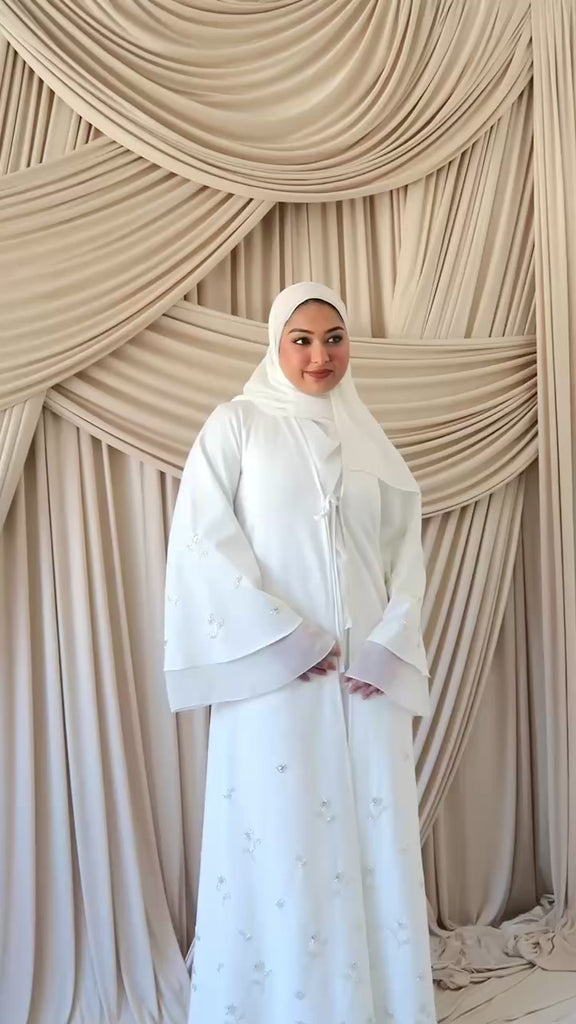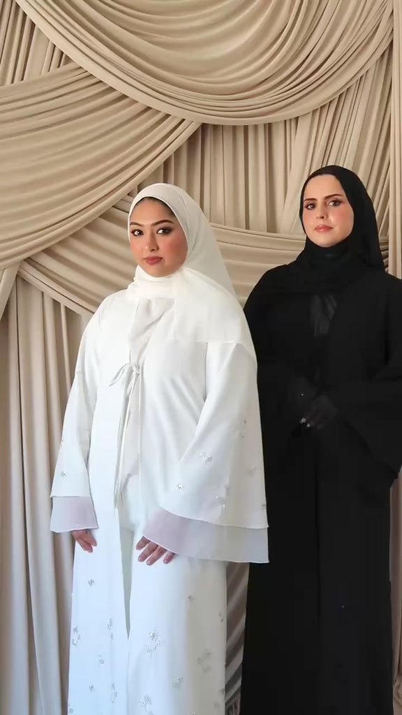 The Beaded Floral Chiffon Cuff abaya blends elegance with ornamental beadwork. It’s designed with lightweight chiffon cuffs that complement the embroidered beading across the silhouette. It’s bound to be a year round modest staple in your formal wardrobe paired, with our Signature Cream SE Trousers.