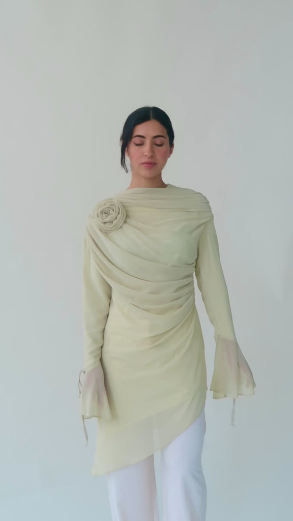 The Draped Rose Tunic blends femininity and romance with its dimensional design. From bell sleeve cuffs with strings, to draping from shoulder to shoulder, to asymmetric lengths and a dainty rose clip, it makes it a one of a kind tunic to style this summer. The rose clip is handmade by Turkish artisans and is completely removable and optional, making it a versatile wardrobe option year round. The bottoms pictured here are not included— only the tunic.