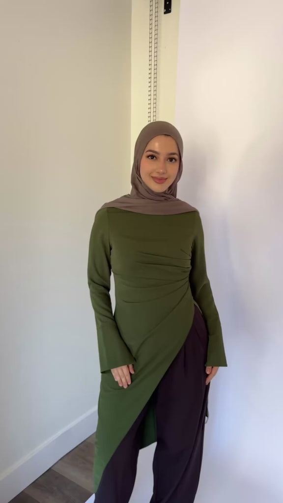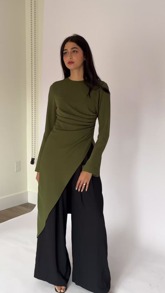 The Asymmetric Slit Tunic — our original thoughtfully sculpted design features a full length slit that adds subtle dimension and modern edge while still offering full coverage. It's elevated, effortless, and versatile, and will be one of those wardrobe pieces you constantly grab for whether styled up or down.