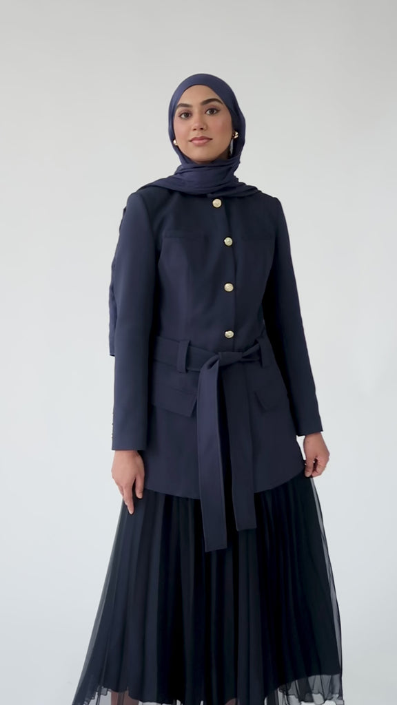 Introducing the SE Belted Jacket— made with custom hardware featuring our signature logo, this one of a kind piece is bound to have heads turning and become a staple in your closet. The fabric is thick and durable and lined with luxurious satin, while also suitable for fall, winter or spring. The jacket is long enough to cover the back, making it a modest choice with our matching skirt or your own wide pants. The jacket closes with clasps inside for easy on and off wear (and metal buttons are just for display). The pockets are nonfunctional and belt is removable and adjustable to your tightness preference.