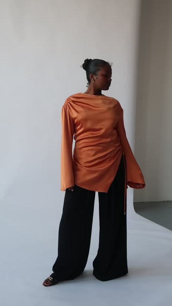 This tunic is the embodiment of the Summer Evenings style—from asymmetric silhouettes, to custom branded hardware, to intricate ruching details, to high quality satin finishes, this satin tunic is a one of a kind formal piece to add to your modest wardrobe. The combination of details makes it the perfect understated, yet stylish top choice for an array of events. The bottoms pictured here are not included— only the tunic.