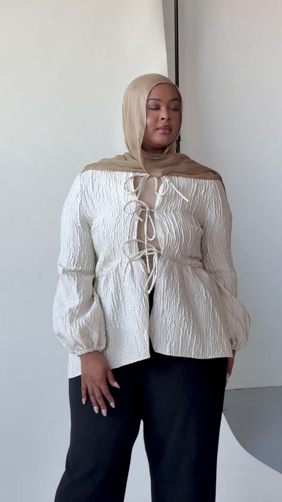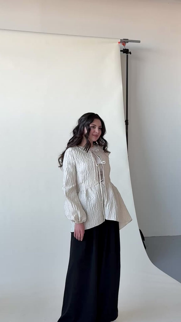 The Pearl Cream Bow Tie Tunic combines femininity, style and playfulness, gong into a spring wardrobe. Made of a shimmering crinkle fabric, it is effortless to wear without any ironing needed, and easy to style from day to night. The bottoms & inner tee pictured here are not included— only the tunic.