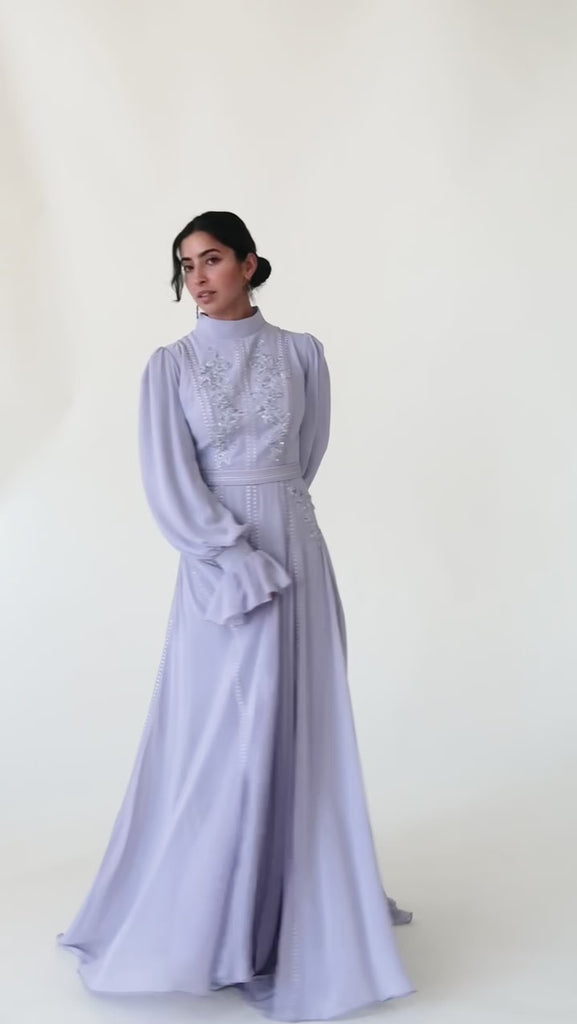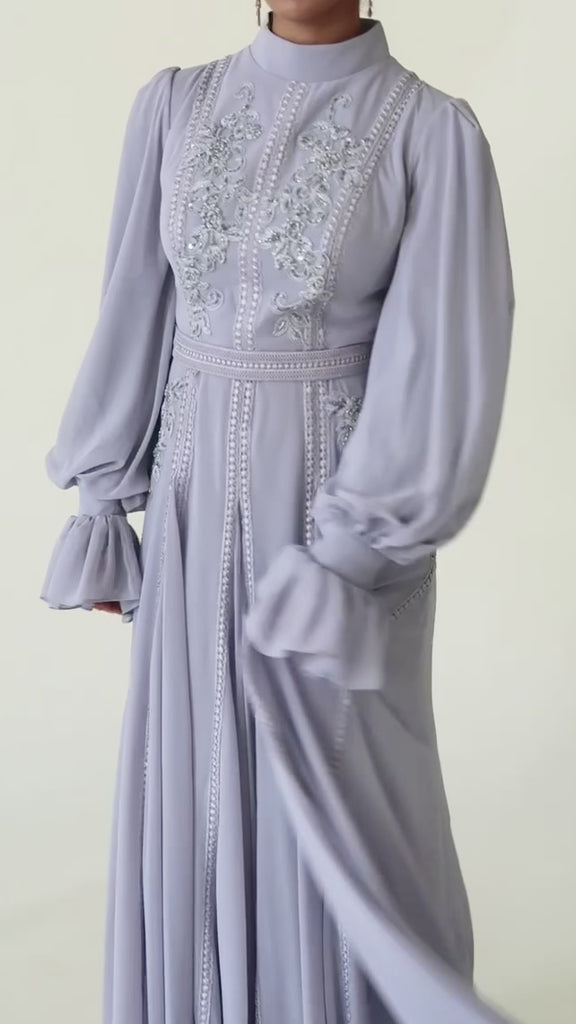 This thobe-inspired gown features hand beaded embroidery across the chest, followed by a flattering low waisted silhouette with slits in the chiffon, and romantic bishop sleeves for a touch of sophistication and elegance.