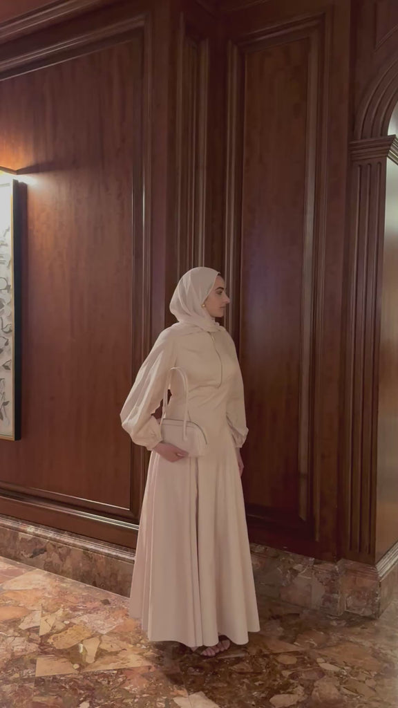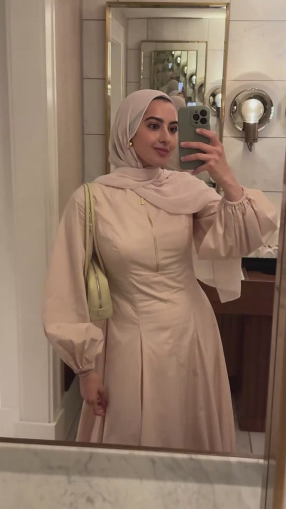 Embrace effortless elegance with the Zip Up Cotton Pleated Dress. It is the perfect feminine spring dress in its balloon sleeves, gold hardware zipper, drop waisted silhouette, elastic cuffs, and wide pleated skirt.
