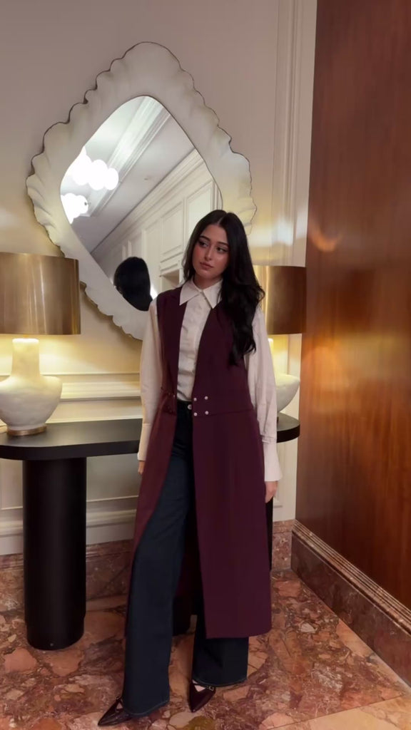 The Floor-Length Vest is an essential spring layering piece that brings effortless sophistication to any look. Designed with a tailored lapel and a sleek, elongated silhouette, it drapes beautifully for a refined, elevated feel. The inner top and pants are not included, and can be worn with your own pairings underneath. It matches our Plum Tailored SE Pants and Ivory SE Tie Back Shirt.