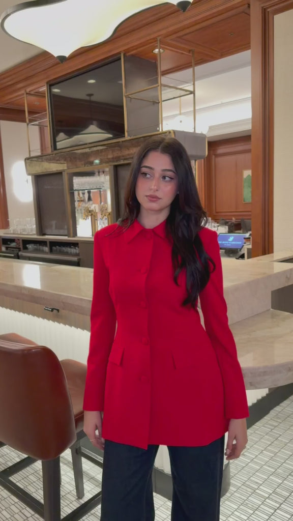 The Peplum Buttoned Blazer is a bold yet refined statement piece designed to elevate any modest wardrobe. Tailored with a structured silhouette, it features a flattering peplum waist that cinches gently before flaring into a graceful shape, creating a feminine and polished look. Finished with elegant button detailing and collar this blazer blends sophistication with modern edge—perfect for layering over dresses, skirts, or tailored trousers for both special occasions and elevated everyday styling. The bottoms pictured here are not included. We recommend pairing with our Cream Tailored Pants or Signature Wide Leg Pants.