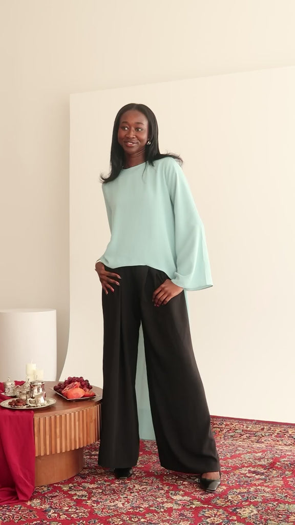 The High-Low Tunic is designed to move beautifully from iftar gatherings to year round celebrations. Its softly curved hemline creates a flattering high-low silhouette that adds dimension and elongates the figure, while maintaining full, effortless coverage. The dramatic bell sleeves bring graceful movement and a subtle touch of occasion, catching the light with every gesture.